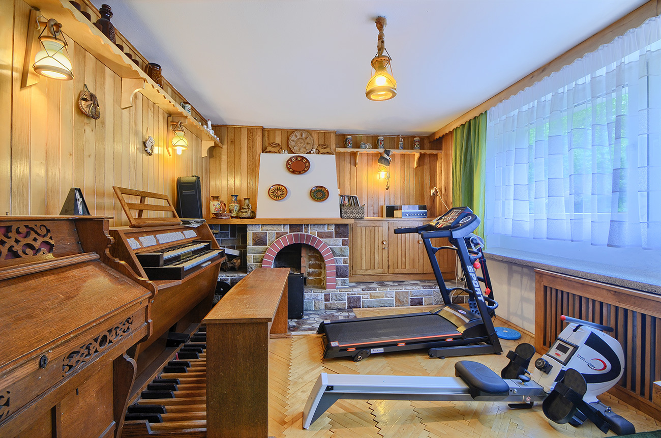 To przytulny salon wyposażony w sprzęt rekreacyjny, kominek oraz organy. Idealne miejsce na wspólne wieczory.